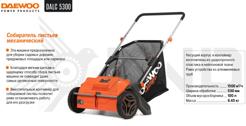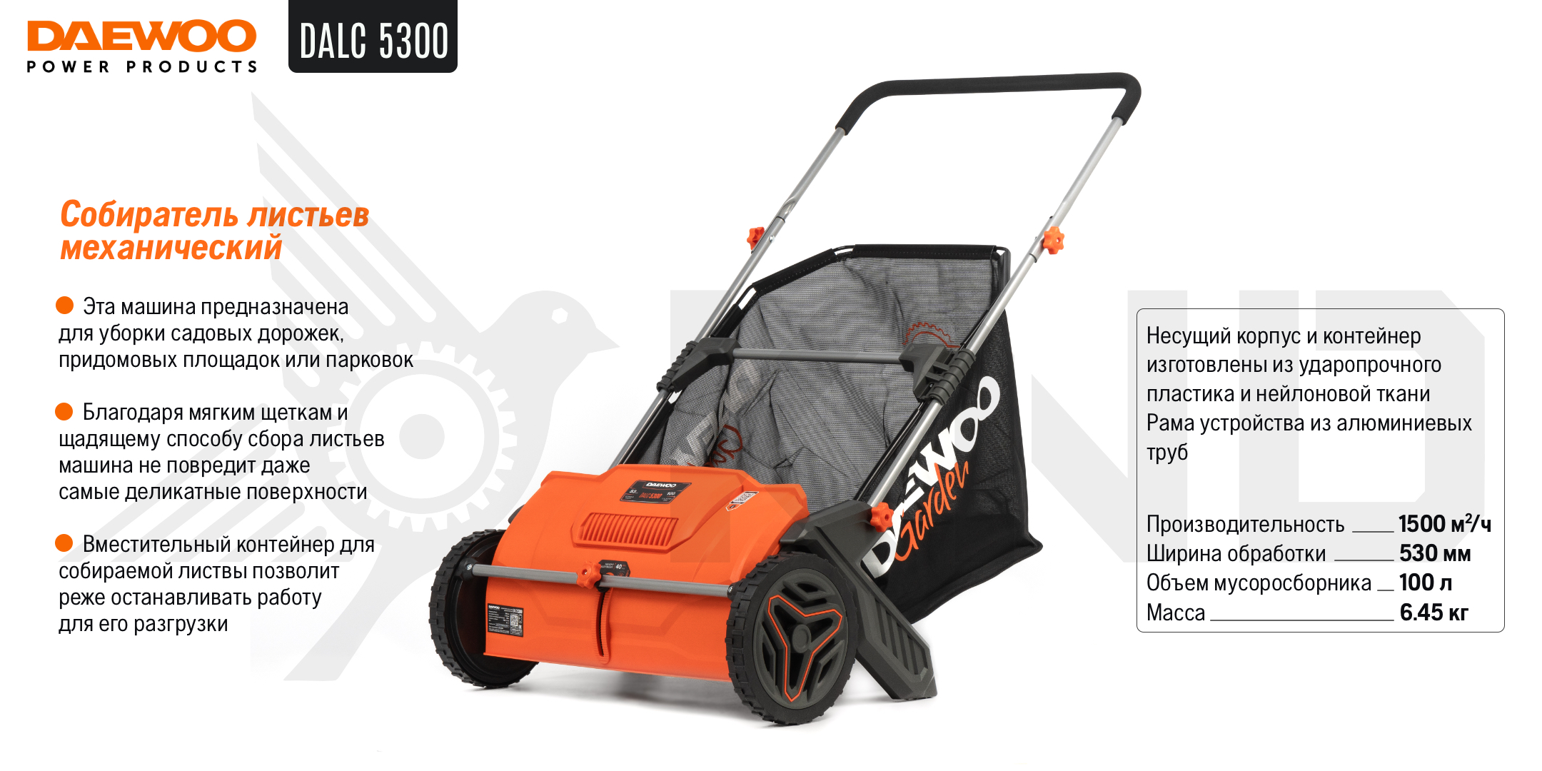 Только у нас собиратель листьев механический DAEWOO DALC 5300 по самой доступной цене! На все товары распространяется гарантия от производителя. Оперативная доставка в Новокузнецке. Оформите заказ сейчас и специалисты интернет-магазина свяжутся с Вами в течение нескольких минут.Документация